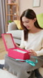 vertical asian woman happily unwrapping ribbon open a gift box in the living room at home