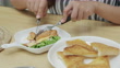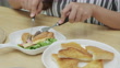 Fast food concept: Asian women are cutting their food using knives and forks, bread and croissant sandwiches in white plates. - 4K stock video