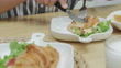 Fast food concept: Asian women are cutting their food using knives and forks, bread and croissant sandwiches in white plates. - 4K stock video