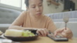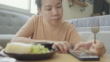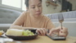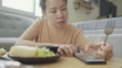 Asian young adults order delivery food and eat mixed salad with fried tofu at home. - 4K stock video