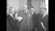L to R: Assistant Secretary of War Robert Patterson, Assistant Chief Clerk of War Frank Hoadley administering oath of office, newly sworn-in Selective Service Director Clarence Dykstra, Secretary of War Henry Stimson during Dykstra's swearing-in to his new role / Stimson, in whose office this event takes place, hands commission to Dykstra and the two shake hands / SOT Dykstra at press conference: "Millions of young men have registered for national service. This does not mean, in my estimation, a process of regimentation. This is a great opportunity for our young men to be come aware of the problems of the nation, to become good citizens, and at the same time to enlist in the service of their country"
