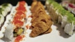 This video clip features an assorted sushi platter with sushi rolls, tobiko sushi, and inari sushi. The vibrant presentation highlights the elegance of Japanese cuisine, making it ideal for themes like sushi, Japanese food, and buffet dining.