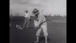At a golf course, famous golf player Gene Sarazen is seen playing and winning the Miami Open. He competes against Al Espinoza of Chicago. The two are seen teeing off, followed by the crowd applauding the players, Miami, Florida, U.S.A., 1927.