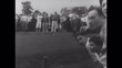 At Fresh Meadow Country Club, crowds of people watch as professional golfers Gene Sarazen and Tommy Armour compete during a tournament. Both wear knickers as golf pants. Armour is seen sinking the final putt and wins a trophy, New York, U.S.A., 1930. Gene Sarazen was an American professional golfer, one of the world's top players in the 1920s and 1930s, and the winner of seven major championships.Thomas Dickson Armour was a Scottish-American professional golfer. He was nicknamed The Silver Scot. He was the winner of three of golf's major championships: 1927 U.S. Open, 1930 PGA, and 1931 Open Championship. Armour popularized the term yips, the colloquial term for a sudden and unexplained loss of skills in experienced athletes.