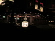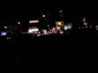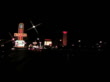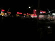 At night. Traveling view from passenger seat of car - Travelodge Hotel, Nob Hill Casino, Denny's restaurant, and Sands Hotel and Casino; glittering sign advertising "Beach Blanket Babylon: Non-Stop Musical Fun" and "Gallagher." Traveling view of Sand Dunes Motel package liquor store at night. Traveling view of the Frontier Hotel and Casino and Desert Inn; sign advertising Smothers Brothers, Jim Stafford, and Ronn Lucas at Desert Inn. Traveling shot of Desert Inn, sign out front advertising The Smothers Brothers, Jim Stafford and Ronn Lucas. Traveling view of Las Vegas Strip, passing by signs and entrances for Monaco Motel, The Stardust, The Gold Key Motel, Peppermill shopping center.