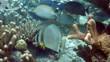 At Sipadan Island - Longfin Batfish (Platax pinnatus) Orangespotted Spinefoot Surgeonfish (Siganus guttatus) and Dotted Sweetlips (Plectorhinchus picus) rest among outcrops of different species of Acropora and Porites coral - 4K stock video