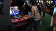 Attendees play games during the South By Southwest (SXSW) Interactive Festival in Austin, Texas, U.S., Close up shots of a pair of hands mashing buttons and moving the joystick on a Mortal Kombat arcade game, A young couple laughs while playing an old Street Fighter arcade game, Wide shot of a row of gamers playing pinball on old pinball machines