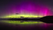 An incredibly colourful display of the Aurora Australis or Southern Lights, with reflection of the aurora in still water, moonlit and with the Milky Way galaxy overhead, greens, blues, reds and purples.