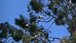 Long-billed Corella birds sit on branches in a eucalyptus tree and are seen against a blue sky.