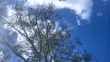 Horizontal landscape looking up to Australian native ghost gum eucalyptus tree trunk and tree top foliage branches and leaves against blue and cloudy sky in Bangalow Byron Bay area