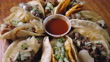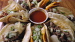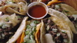 Authentic street tacos are served on warm, soft corn tortillas with tender carne asada, melted cheese, a squeeze of lime, and presented on a rustic wood cutting board - 4K stock video