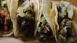 Authentic street tacos feature tender carne asada on soft corn tortillas, topped with cheese, fresh lime, and chopped cilantro and onion, on a rustic wood cutting board. - 4K stock video