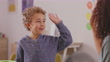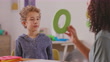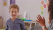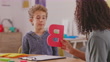 Autism, education and adhd with teacher and student high five during learning disability assessment. Happy, fun educator motivation, celebration while teaching alphabet letter for boy with dyslexia - 4K stock video
