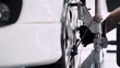 Auto technician mechanic adjusting wheel balancing at the garage. Vehicle maintenance auto service workshop.