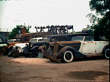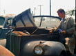 Automobile junkyard in Southern California, numerous abandoned classic and vintage cars scattered about, rusting and weathering / man wearing dirty frock coat, lifting hood of junked 1930s Packard V12 (V12, 12 cylinder), shaking his head, adding can of STP, tossing can, closing hood, removing coat, climbing onto hood and leaping behind wheel / junked 1950s Pontiac Star Chief in junkyard / abandoned, sun baked, junked 1930s Packard V12 convertible and Super Eight sedan / rows of striped, junked, abandoned classic cars / Classic Cars showroom, sales office; Volkswagen Beetle (VW Bug) and pickup truck parallel parked out front. Vintage Packards on January 01, 1968 in California (Footage by Getty Images)