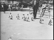 Aviary at the Bronx Zoo / flamingos in a pond / a bird being held / zookeeper releasing a bird / zookeeper feeding penguins / penguins eating small fish in their zoo habitat / penguins walking in the zoo, outside of their exhibit / penguins climbing up a set of stairs / penguins climbing down stairs / chimpanzees in clothing and soldier hats, holding guns at the Detroit Zoo / a rifle shot hits a caricature of Hideki Tojo / the picture falling down / the chimpanzees standing with the enemy caricature.