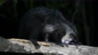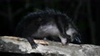 The aye-aye (Daubentonia madagascariensis) is the sole member of its prosimian genus. It is a largely nocturnal animal, and lives in the wild in two small forest areas on the island of Madagascar. When full grown, the aye-aye has a body length of 45 cm, with a bushy tail 10 cm in length. Its main food source is beetle larvae. The aye-aye knocks on tree bark until it hears a hollow sound with its enlarged ears. It then bites through the bark and wood to locate the larvae. It uses its extended and slender middle finger to extract larvae from the interior. The aye-aye is now extremely rare, due to the destruction of its forest home, and is on the verge of extinction. The individual in the clip has been relocated to a protected island off north eastern Madagascar. The island has 7 aye-ayes, which roam freely but their diet is supplemented to enable the rangers to monitor these animals when they visit the feeding stations. Filmed on an island in north eastern Madagascar