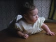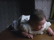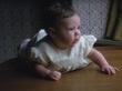 A baby is lying face down on a wooden surface, wearing a white dress with puffy sleeves. The baby's head moves from an elevated position to looking to the left, downwards, and then forward, displaying a range of curious and pensive expressions. The background includes patterned wallpaper and a curtain.