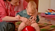 child sitting on the pot, mother makes the baby massage the abdomen
