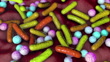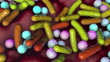 Animation of a mixed community of bacteria, including rod-shaped (bacillus) and spherical (coccus) bacteria. A wide range of such bacteria are found in the healthy human intestines, including the rod-shaped Bacteroides and Escherichia, and the spherical Enterococcus and Staphylococcus