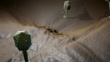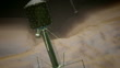 An animation depicting the infection of E.coli by Enterobacteria phage T4. The camera zooms in and then rotates showing a number of T4 phage adhering to the surface of an E.coli bacterium.