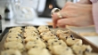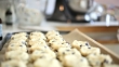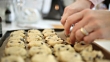 Close up of hands putting cookie dough onto cookie sheet in kitchen. Selective focus on hands working.