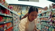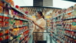 Caught in the moment, a woman examines product labels closely as she navigates through a grocery store, emphasizing the importance of making informed choices while shopping.