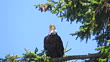 A lone mature bald eagle perched high in a tree off the coast of western Washington State scratching its head with its claw.