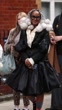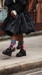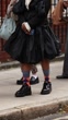 LONDON, ENGLAND - SEPTEMBER 20: (SLOW-MO) Barbara Ayozie Fu Safira wears black jacket, black balloon midi skirt, ivory blouse, neon orange and blue socks and Miu Miu black loafers outside Yuhan Wang during London Fashion Week on September 20, 2025 in London, England. (Footage by Hanna Lassen/Getty Images)
