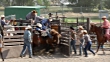 Bucking bronco, bareback rider in an outdoor rodeo stadium.
