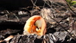 Single stinky (Clathrus) basket fungus growing out of mulch in harvested forest understory. A couple ants wander about the strangle looking structure. Footage shot in Madison county, North Florida