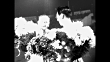 Batter hits ball in baseball play / WS huge crowd in Korakuen Stadium, can see Japanese people sitting in bleachers / New York Yankees stand in a line with caps over their hearts / section of audience, Japanese and Americans / Casey Stengel, manager of the Yankees and Kaoru Betto, manager of the Mainichi Orions are presented with flowers / MS Stengel and Betto talking on the field holding flowers / MS section of audience / Thomas E Dewey, former New York governor, waves standing behind safety net / Mrs Ishiro Kaoruko Hatoyama throws out the first ball / she bows / birdseye view of baseball players running to and from dugout / MS two American men sitting in bleachers, one wearing military uniform, can see audience section behind them