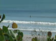 a lone surfer waits for a wave on an ocean beach, with sea grapes and sea oats in the foreground