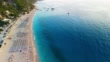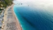 Amazing coast with beautiful beach with parasols in a row and small village around on Ionian sea. Kathisma beach, Lefkada island, Greece
