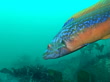 Beautiful colours of male Cuckoo wrasse swims to diver, Green blue water, MS - stock video