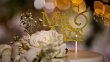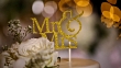 Close up beautiful wedding cake with Mr. & Mrs. sign at wedding dinner.