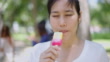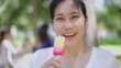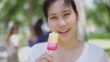 Beautiful woman smiling while biting colorful popsicle ice cream. - 4K stock video