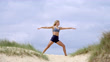 A beautiful Yoga practitioner doing the 'Revolved Side Angled Pose' on sand dunes on the coast. - 4K stock video