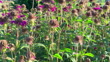 Spent bee balm (Monarda) flowers with dried seed heads rise above green leaves and fading purple blooms.