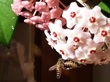Bee gathering pollen from the Hoya Carnosa, the porcelainflower, showcasing the beauty and harmony of nature. Perfect for illustrating biodiversity and the importance of pollination in ecosystems.
