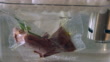 Close up rump steak being cooked with olive oil and rosemary in airtight zipper storage bag. Immersion circulator, polycarbonate water bath and insulation balls on top of water.