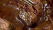 A beef stew is placed into an oven by a person wearing pink oven gloves; close-up of a fork on a cooked piece of beef.(Core number: FKJF081S. ABUA599J)