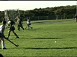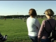 FIELD HOCKEY: GOOD, ZO WS Behind backs of several Caucasian females (30's-50's), mothers watching high school field hockey day game (girls & boys), 1st team in white & grey uniforms, 2nd team wearing green & white uniforms.