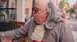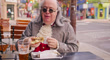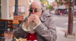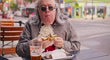 A medium close up shot of an actor impersonating Benjamin Franklin eating cheesesteak while sitting in an outdoor patio on a sunny day in modern-day Philadelphia. Featuring Brian Patrick Mulligan as Ben Franklin.