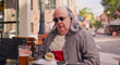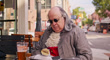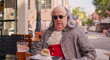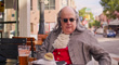 A medium close up shot of an actor impersonating Benjamin Franklin with a beer glass and a cheesesteak while sitting in an outdoor patio on a sunny day in modern-day Philadelphia. Featuring Brian Patrick Mulligan as Ben Franklin.
