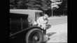 The driver of a 1930 Bentley Speed Six Tourer pulls over to the side of the road during a 1962 antique car rally. With the help of a Volkswagen Microbus support vehicle, he fills the radiator with water. He waves as the microbus leaves. Then he closes and straps down the hood.