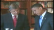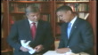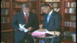 Berlin Mayor Klaus Wowereit presents U.S. Presidential candidate Barack Obama with a porcelain Berlin bear and invites him to sign the city's golden book.