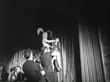 Betty Grable dancing, performing on stage while wearing revealing showgirl outfit and holding fan / Betty Grable performing, Buddy Rich playing drums and Harry James playing trumpet in background / male dancers lifting and carrying Betty Grable from stage / Betty Grable receiving flowers on stage following performance / Betty Grable smiling, prancing off stage