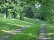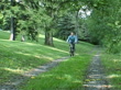 NTSC Video of a woman riding her bicycle in a very natural country or city park setup at the beginning of fall.