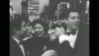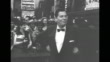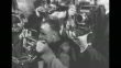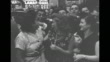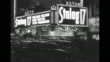 Title card: "Big Benefit Premiere in New York" superimposed over twinkling stars / LS EXT Astor theater and marquee showing Stalag 17 with crowd gathered outside / high angle crowd in lobby / in lobby former inmates of the original Stalag 17, Walter Debak, Myron Maleski, George Gera, Jerry Gerber, Don Cassidy and John Campbell wear tuxes and stand behind barbed wire as Captain Joseph McConnell, jet ace of Korean War shakes hands with one / CU certificate of appreciation to Don Cassidy / McConnell hands out certificates of appreciation to them and shakes hands / dark shot looking through window to street, lobby crowd in fgd / actress Gloria Swanson arrives / CU photographers taking photos / Jinx Falkenburg and Swanson at WOR microphone / crowd / General Kenneth Webber of the US Air Force and wife and Lieutenant John Waibel (aid to Webber and his wife) arrive / actor and comedian Milton Berle and actress Ruth Cosgrove arrive / actors Robert Strauss and Harvey Lembeck clown around with crowd / Strauss and Lembeck clowning kiss Cosgrove and Berle / lobby crowd / Air Force nurse Lieutenant Marie Van Der Muler pours champagne for ex prisoners of war in mess kits / former prisoners of war drink champagne / EXT theater